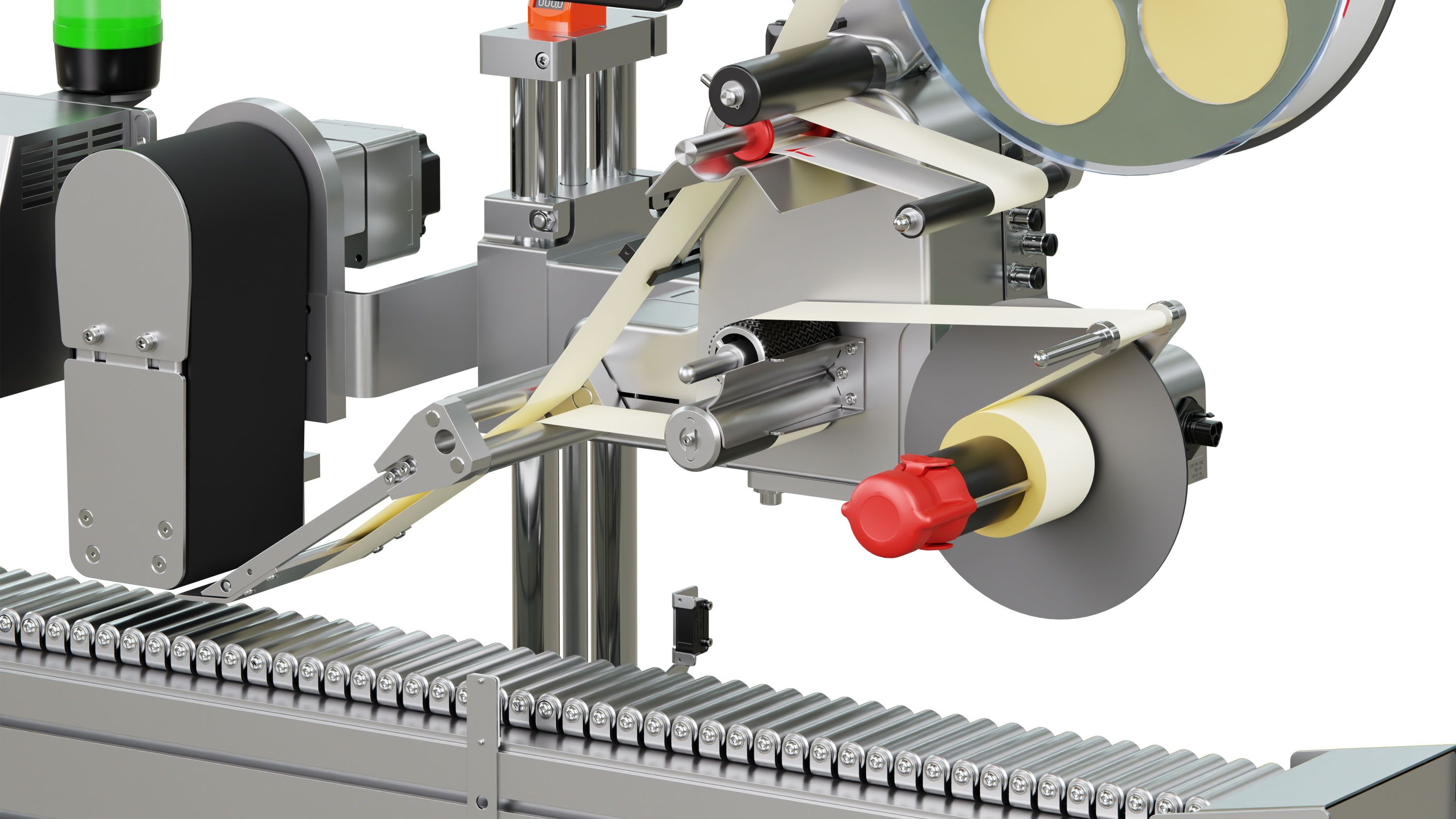Etiquetage circulaire de produits cylindriques couchés avec jusqu’à 2 étiquettes – avec orientation