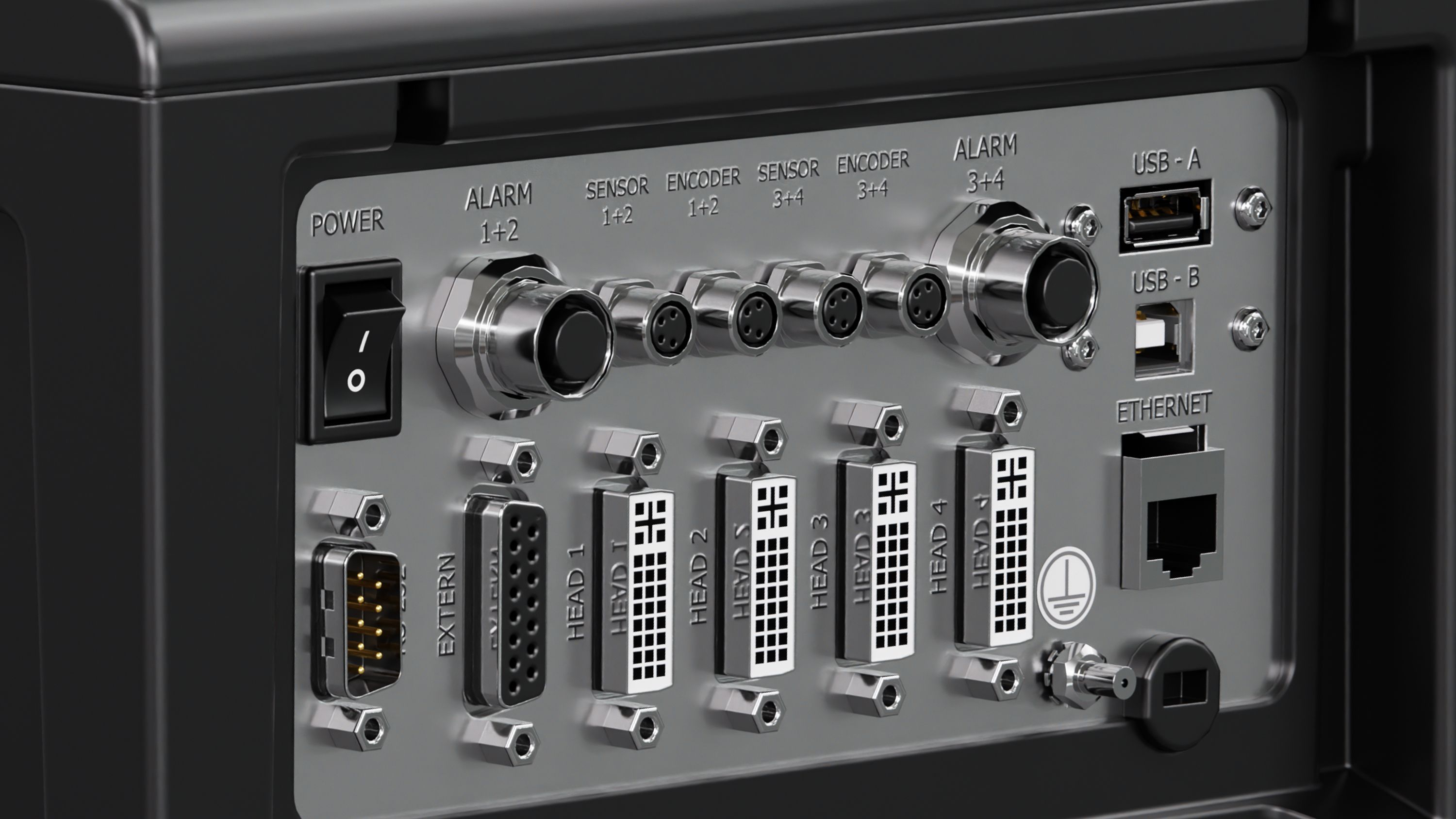 Ethernet (TCP/IP), RS-232, USB (indelingen overbrengen, instellingen wijzigen), USB-B-aansluiting, M8-aansluiting voor draaisensor en sensor, M12-aansluiting voor PoE en in- en uitgangen